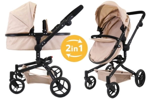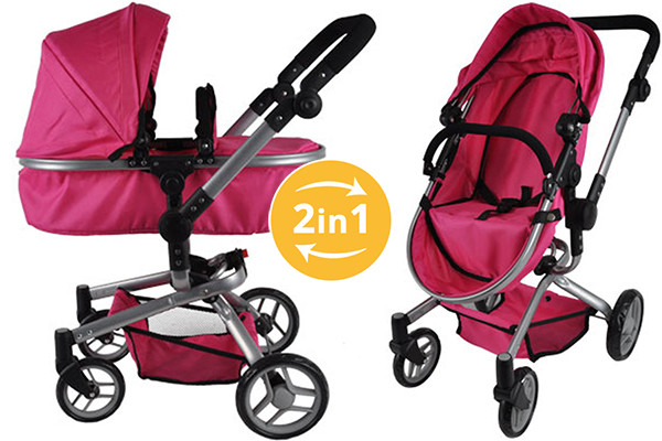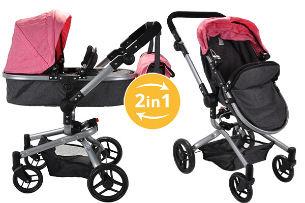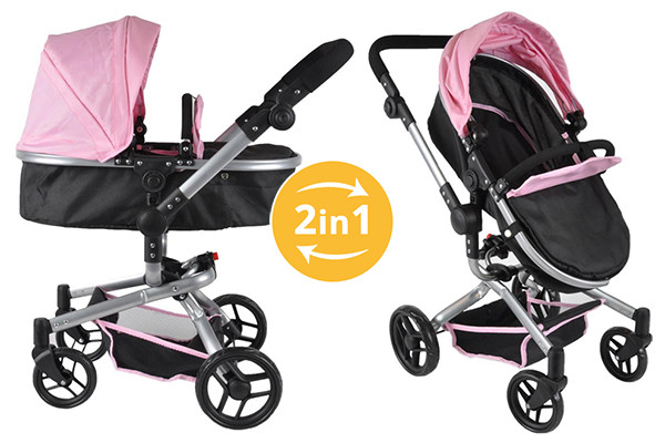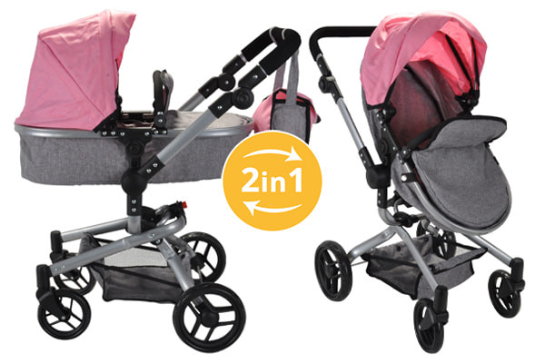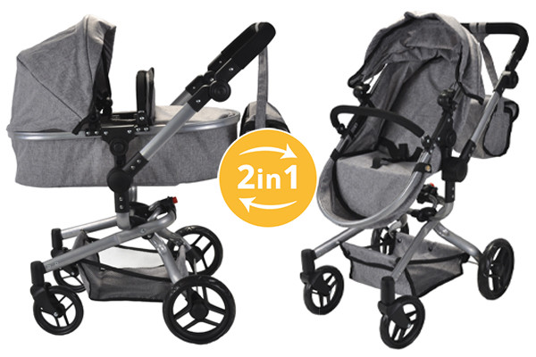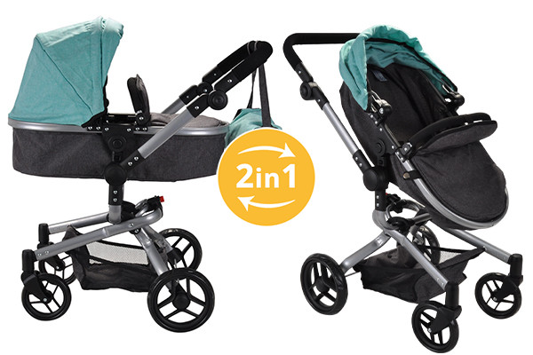 Een 2in1 poppenwagen in een prachtige groene kleur met zwart frame! De poppenwagen is in een handomdraai om te zetten naar een buggy. Dankzij de verstelbare duwstang (48-81 cm) groeit het wagentje lang mee. De zwenkwielen voorop zorgen voor een soepele rit. Onderop de poppenwagen hangt een handig boodschappenmandje. De kap is eenvoudig inklapbaar. Net zoals de hele poppenwagen overigens! De Modern Angel 2in1 is geschikt voor poppen tot 50 cm.