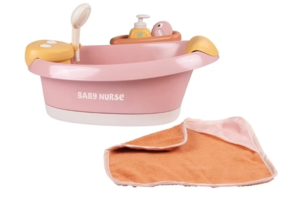 Dit poppenbad is van alle gemakken voorzien! Vul het badje met water en laat het water bubbelen. Ook gaan er gekleurde LED-lichtjes branden. De thermometer verandert van kleur wanneer deze warm water aanraakt. De douchekop kan echt water sproeien. Klaar met badderen? Maak de pop droog met de handdoek. Het badje is 40x30x23 cm. Voor poppen tot 42 cm. Exclusief pop en 3x AAA-batterijen.